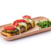 Μοτσαρέλα, πουρές μελιτζάνας, πέστο βασιλικού, κονφί ντοματίνια & θυμάρι.
